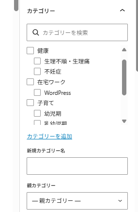 カテゴリは、記事を作成するときに、右側の「カテゴリー」で作成しておきます。