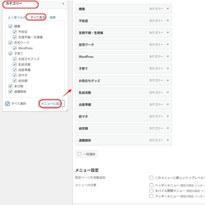 私の場合は「カテゴリ」→「すべて表示」→「メニューに追加」