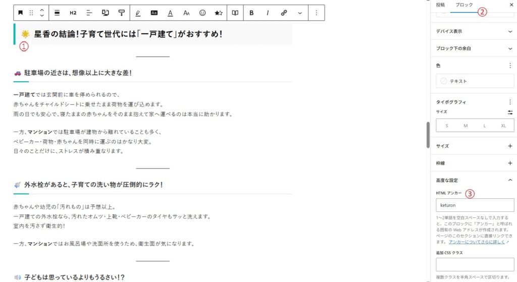 超初心者がよく困るのは、アンカーの設定場所が分からない点です。見出しブロックや段落ブロックに「HTMLアンカー」を設定するだけで準備が整います。難しい作業は一切なく、手順を覚えるだけで簡単に使えるようになります。