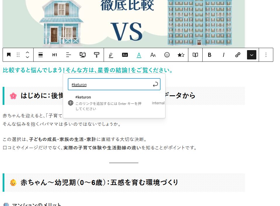 入力欄に「#アンカー名」をそのまま入れ、Enterをクリックするだけでページ内リンクが完成します。
