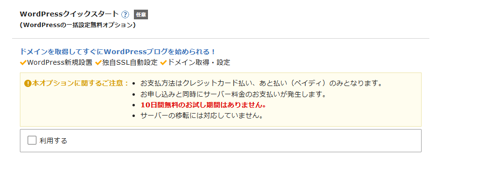 「WordPressクイックスタート」の欄で「利用する」にチェックを入れてください。これだけで、面倒な設定が全て自動化されます。