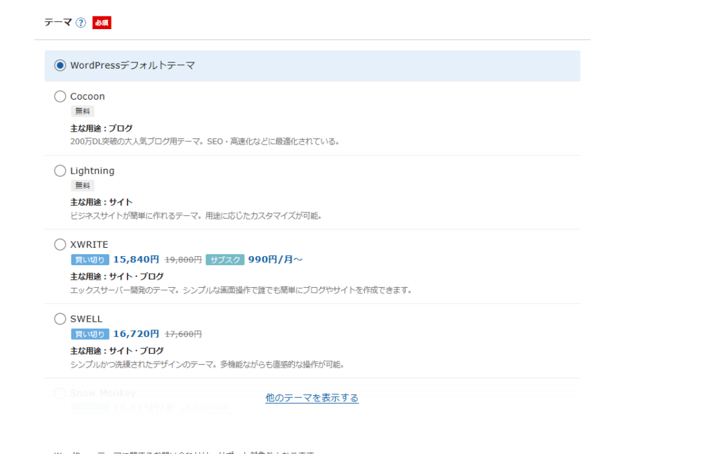 テーマはサイトのテンプレートです。後から変更もできるので、無料のものを選択しておいて大丈夫です。