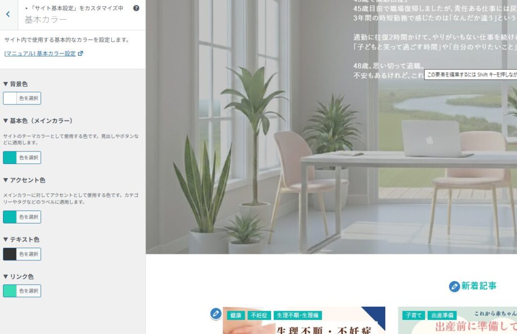 「サイト基本情報」の左横の左矢印から前のページに戻り、「基本カラー」を選択します。